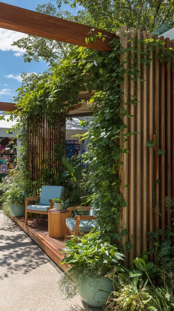 Create privacy and visual interest with a vertical screen divider, trellis, or slatted panel that blocks sightlines from neighbors while maintaining airflow and light penetration. Choose materials matching your aesthetic from natural wood and bamboo for organic warmth to metal panels for industrial edge or composite materials for low maintenance.