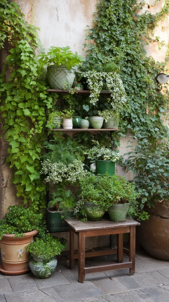 Utilize vertical space with tiered plant stands or etageres that display multiple plants, decorative objects, and outdoor accessories without consuming floor area. Choose stands in materials like metal, wood, or wicker that complement your patio style while providing multiple levels for visual interest. Arrange plants of varying heights, textures, and colors on different tiers, creating a living sculpture that draws the eye upward and adds lush greenery. Include small solar lanterns, candles, or decorative objects between plants for personality that makes the display feel curated rather than simply functional.