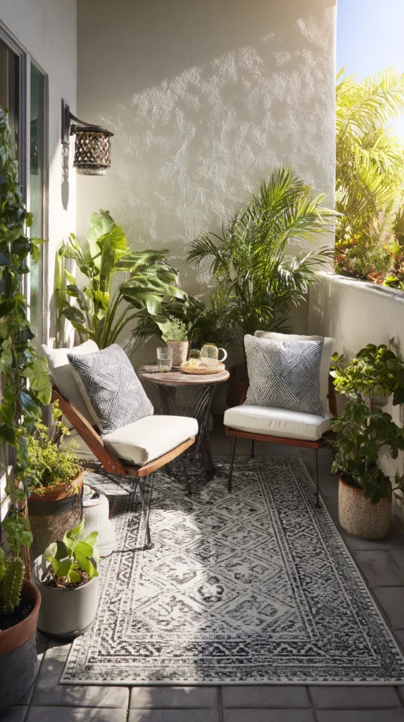 The rug creates a room-like feeling that psychologically expands the space by establishing clear boundaries and adding softness that contrasts hard patio surfaces. Select sizes that leave a border of exposed patios around the edges rather than covering the entire surface, which can make small spaces feel even more confined.