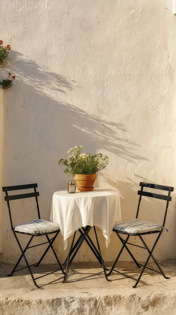 Metal bistro sets in black, white, or colored finishes add charm while remaining weatherproof and easy to maintain throughout seasons. Add a small tablecloth, potted plant centerpiece, and comfortable chair cushions that transform the simple setup into an inviting outdoor dining destination.