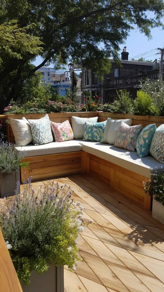 Top the bench with thick weather-resistant cushions and decorative pillows that add comfort and personality while being easily stored during inclement weather. This approach works particularly well in corner patios where L-shaped benches create cozy conversation areas that feel intentionally designed rather than cramped.