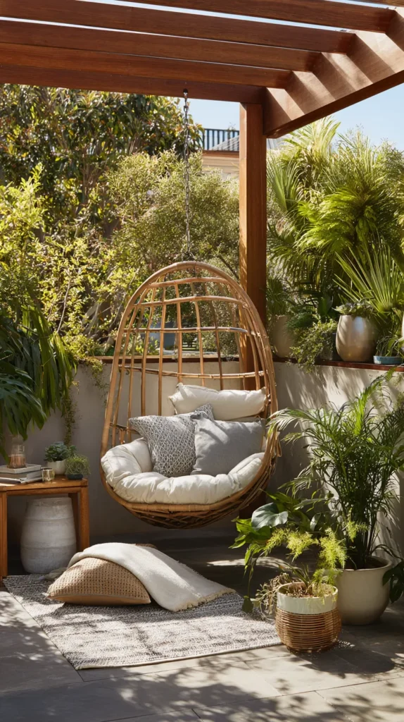 Choose styles ranging from bohemian macramé for casual charm to sleek egg chairs for modern sophistication, ensuring the design complements your overall aesthetic. Add outdoor pillows and a small side table within reach for drinks, books, or devices to complete the cozy retreat.