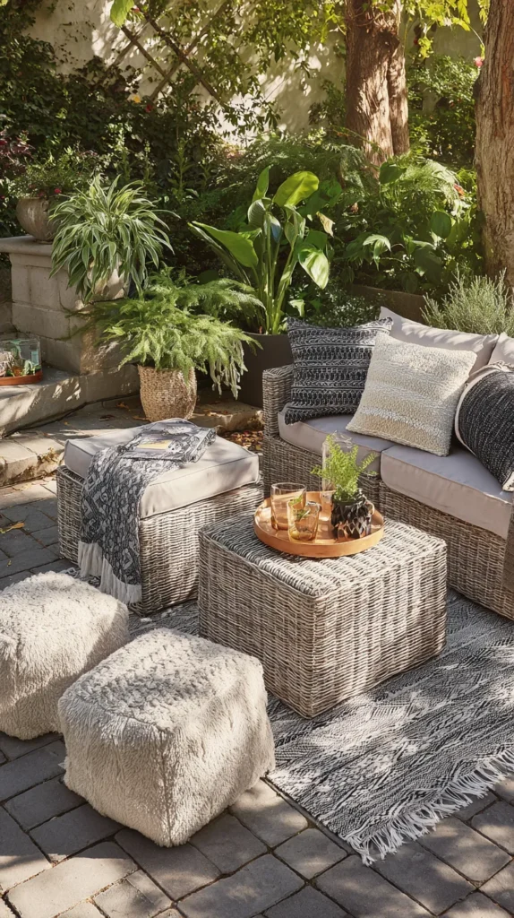 Incorporate storage ottomans or outdoor poufs that serve triple duty as seating, footrests, and hidden storage for items you want accessible but not visible. Choose weather-resistant wicker, resin, or fabric options with waterproof interiors that protect stored items from moisture and humidity.