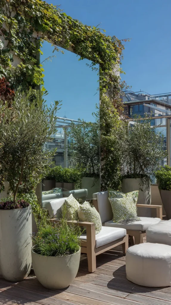 Position the mirror to reflect your most attractive view, whether that’s garden plantings, interesting architecture, or the sky, avoiding direct reflection of clutter or unappealing elements. Frame the mirror with climbing vines or surrounding plantings that integrate it naturally into the patio design rather than making it appear artificially placed.