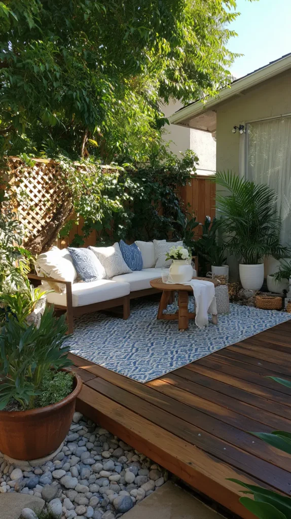 The raised platform, even if only a few inches high, creates an architectural dimension that makes the patio feel more designed and intentional. Add outdoor rugs, potted plants around the perimeter, and furniture specifically scaled to the platform size to complete the designated zone.