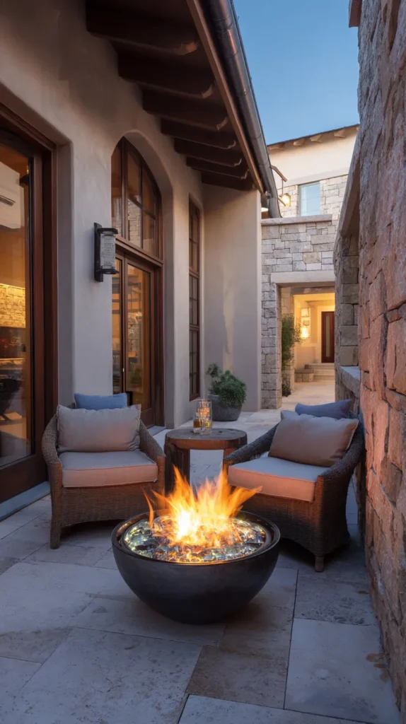 The flickering flames create a natural gathering point that draws people to the patio during cool evenings, making the small space feel warm and inviting. Surround the fire feature with comfortable seating at appropriate distances, adding throws and pillows for cozy extended outdoor sessions.