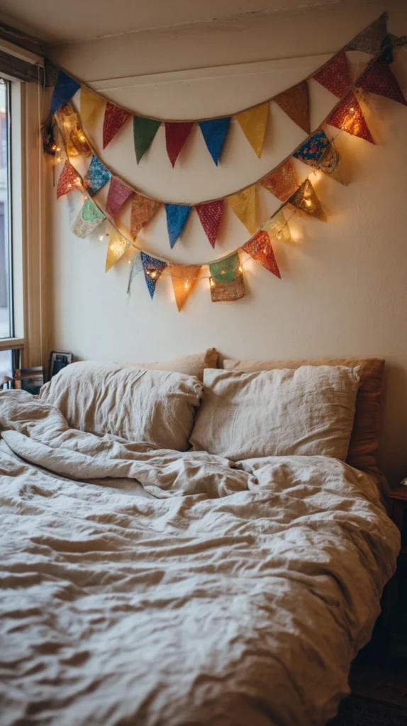 A row of small national flags strung on twine above the headboard transforms the focal wall of the bedroom without touching the walls themselves. Use the flags of every team in your group stage, every team you are following, or simply the nations whose football means the most to you. The effect is colourful, festive, and unmistakably tied to the tournament without tipping into the territory of a sports bar.