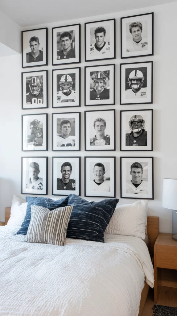 Print large black and white portraits of two or three players β legendary figures from past tournaments, current stars of this one, or the heroes of the team you are supporting β and arrange them in a simple grid or column on one wall using removable strips. Black and white printing costs almost nothing and produces a clean, graphic look that sits comfortably in a bedroom in a way that colourful commercial posters often do not.