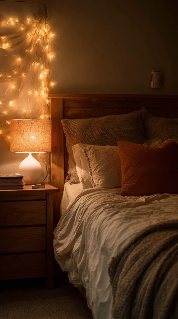 Swap the bedside lamp bulb for one in amber or warm white and add a secondary light source β a string of battery-powered fairy lights looped around the headboard or a small LED lantern on the windowsill β so the bedroom has layered light in the evening rather than a single overhead glare. Warm layered lighting makes any space feel more atmospheric, and during a tournament it makes the bedroom feel like a place to settle into rather than simply sleep in.