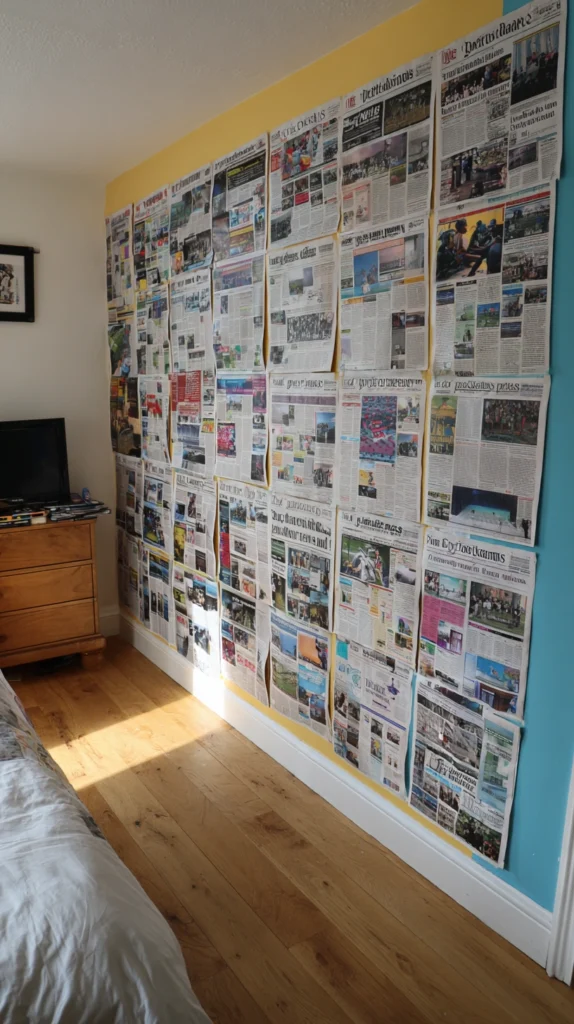 Printing a newspaper front page at home costs nothing beyond paper and ink. A small print shop will print an A4 page for $0.20β$0.50. Removable adhesive picture strips ($6β$12 for a pack) hold the prints flat against the wall without damage. Use frames if you own them β even mismatched frames give the gallery more weight and intentionality than prints pinned directly to the wall.